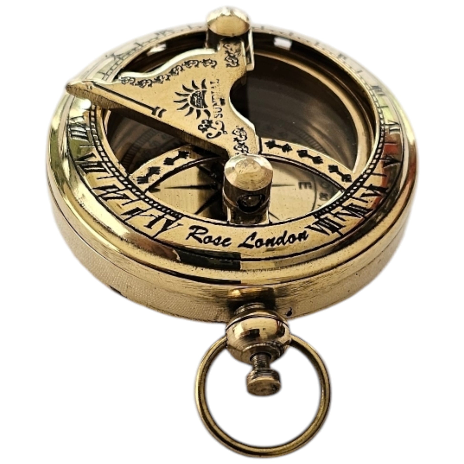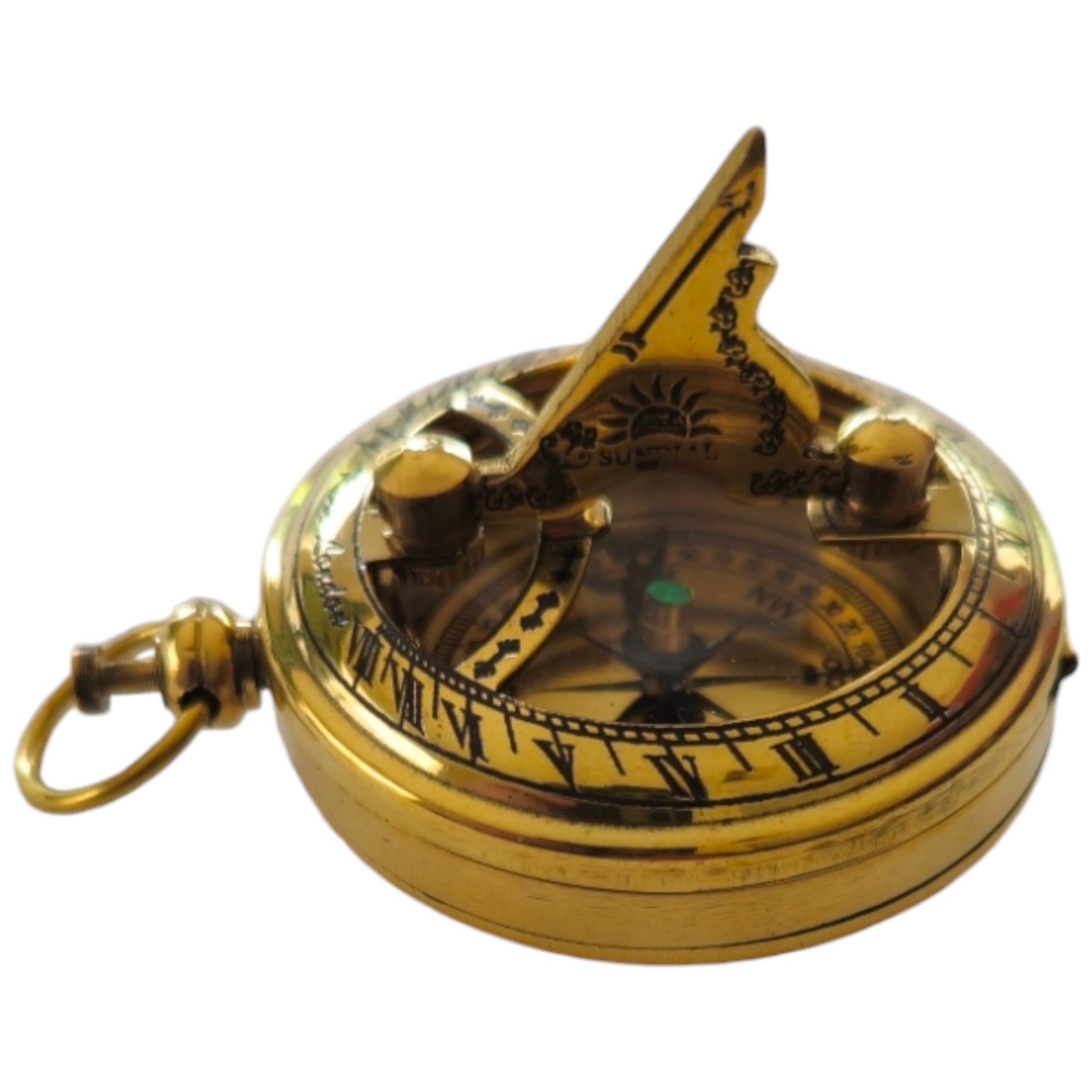 - Functional Navigation Tool & Sundial | A working brass compass with a precision needle and a built-in sundial for timekeeping.